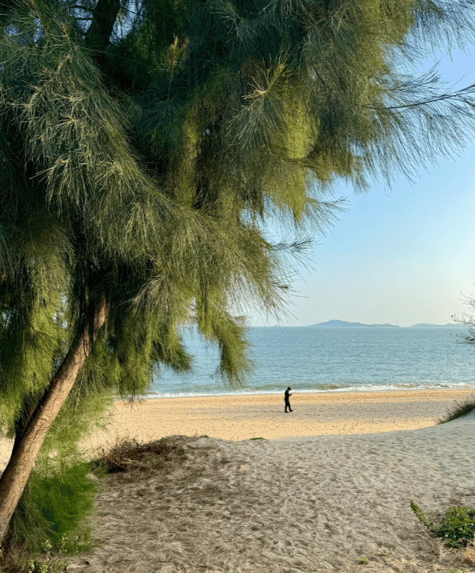 下午的白城沙滩成了孩子们的乐园。他们赤脚追逐浪花,笑声和海浪声交织在一起。珊珊提醒我们注意安全,并遥指胡里山炮台,预告了明天的行程。
