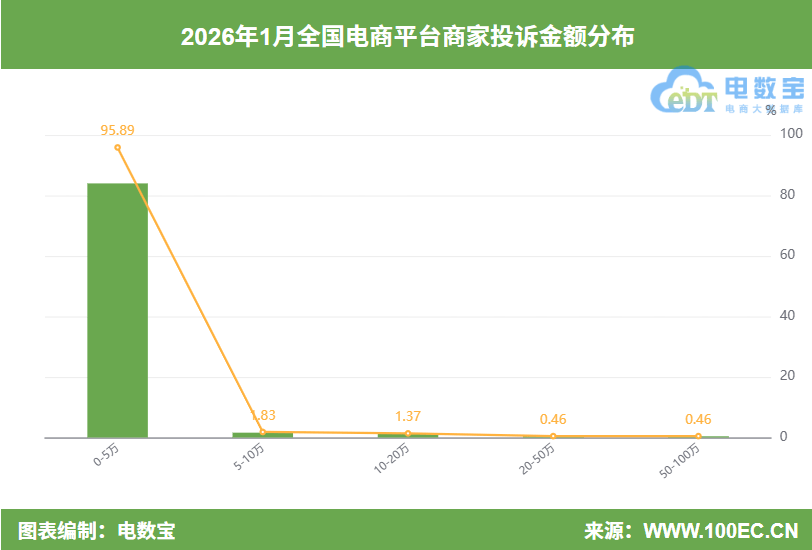 据“电诉宝”显示,1月商家投诉金额分布主要集中在0-5万(95.89%)、5-10万(1.83%)、10-20万(1.37%)、20-50万(0.46%)、50-100万(0.46%)。