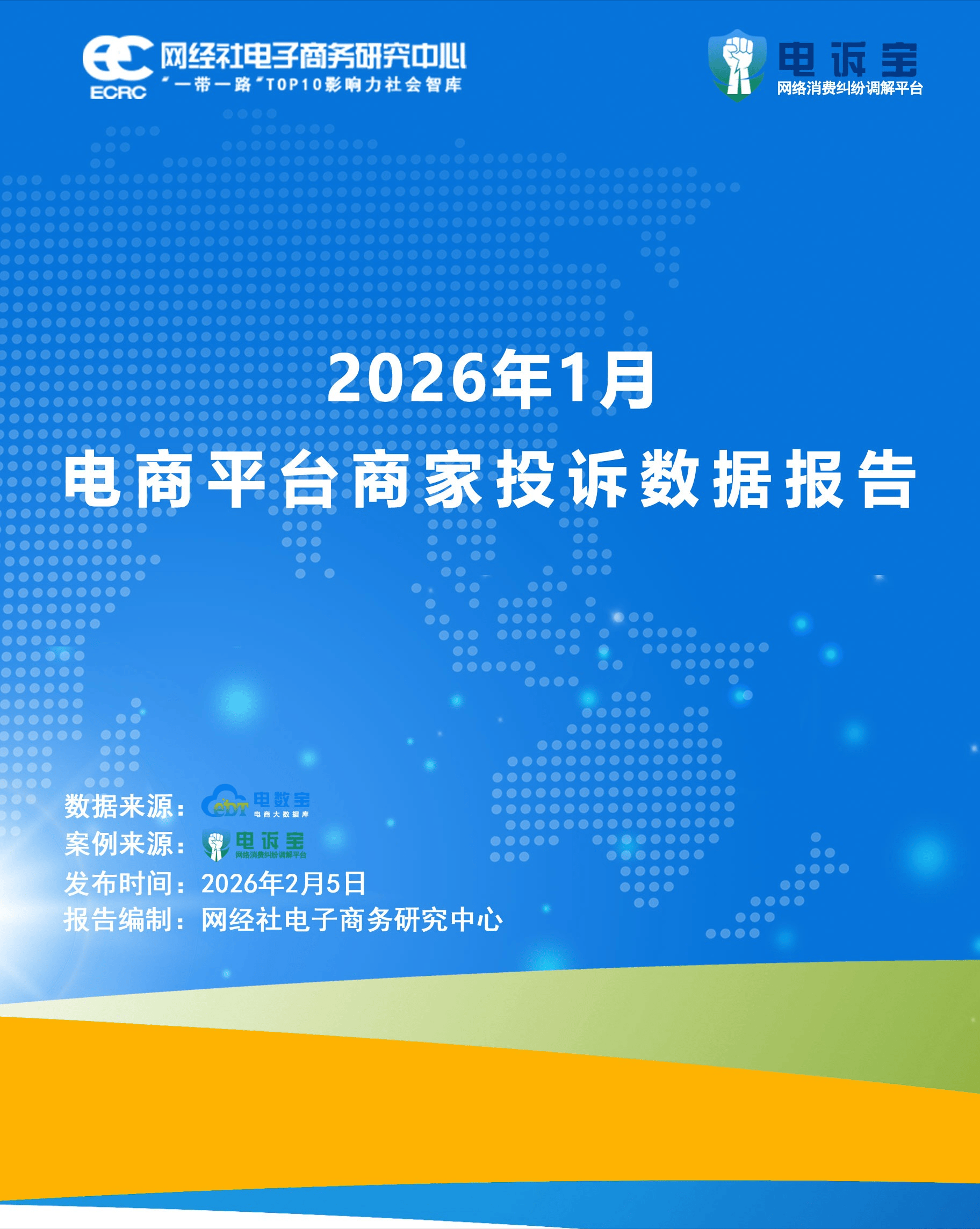 在此背景下,2月5日,依据网络消费纠纷调解平台“电诉宝”商家投诉通道1月受理的全国电商平台大量商家投诉案例,网经社电子商务研究中心例行发布《2026年1月电商平台商家投诉数据报告》。报告涉及了综合电商、直播电商、电商服务商、生活服务电商等领域,并公布了1月电商平台商家投诉数据及十大典型案例,通过这些投诉案例可窥见当前电商平台商家困境。