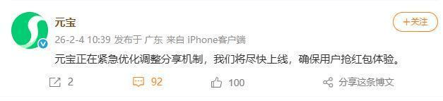 此后,元宝方面表示正在紧急优化调整分享机制,将尽快上线以确保用户抢红包体验。