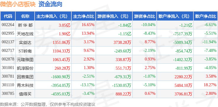 从资金流向上来看,当日微信小店板块主力资金净流入4.31亿元,游资资金净流出2.68亿元,散户资金净流出1.63亿元。微信小店板块个股资金流向见下表: