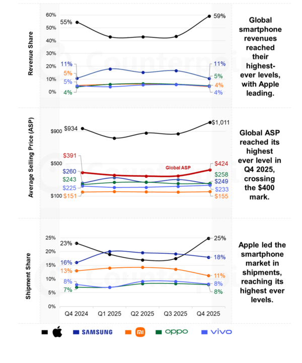 【CNMO科技消息】2月5日,据Counterpoint Research发布的《Market Monitor Service》报告,2025年第四季度,全球智能手机市场收入同比增长13%,达到1430亿美元(约合人民币9930亿元),创单季度历史新高。同时,手机平均售价(ASP)同比增长8%,首次在单季度内突破400美元(约合人民币2777元)。