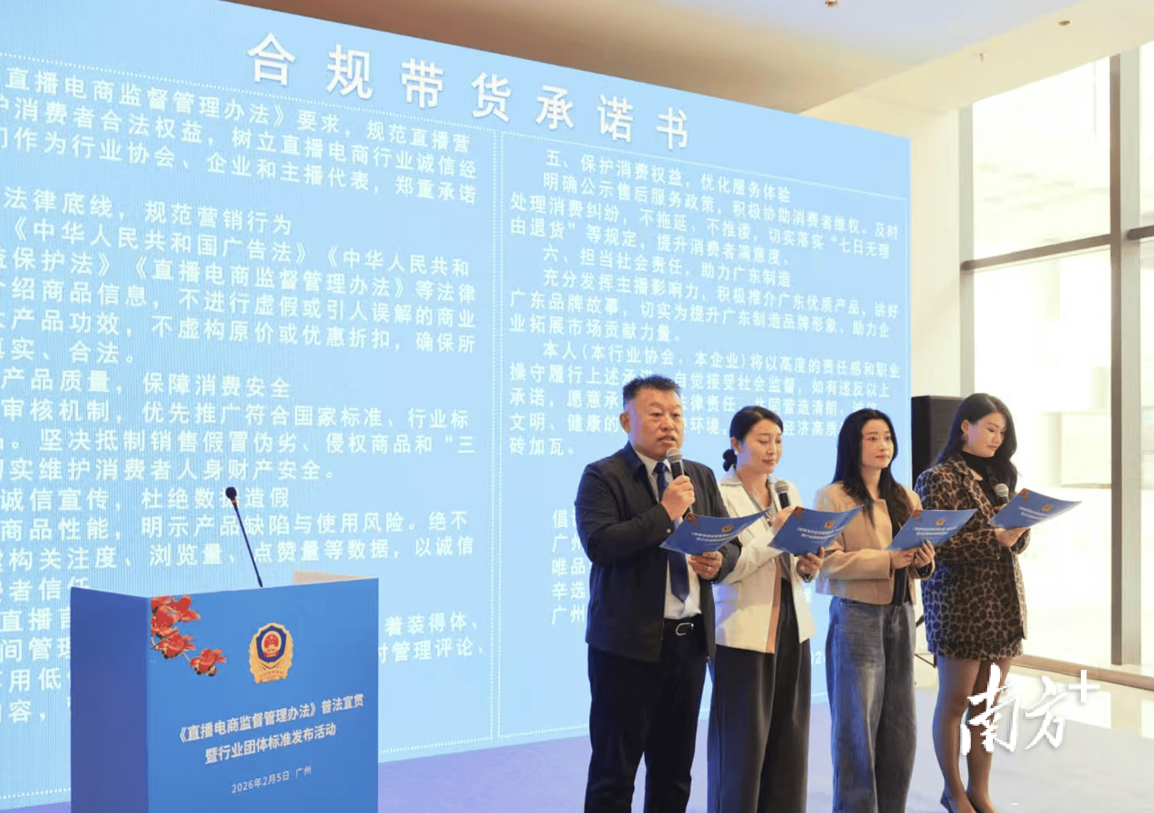 现场,广东省网商协会发布了《放心消费直播间建设与管理规范》团体标准,首次系统化构建了放心消费直播间“建设—运营—评价—管理”全流程规范,形成了从资质审核到动态退出的全生命周期管理闭环,突出消费者合法权益与未成年人保护,强调AI等新技术管理,将合规硬约束转化为企业竞争力。会上,广州市直播电商协会和主播代表们共同发起合规带货倡议,公开承诺坚守法律底线,严把产品质量,优化服务体验,保障消费权益,传播正向能量,自觉接受社会大众的监督。