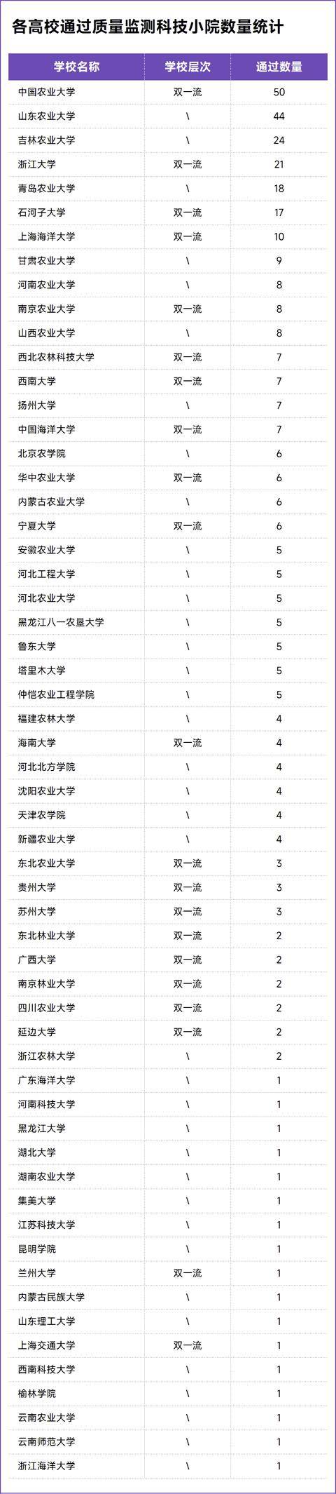 通过质量监测的370个科技小院中,366个来自高校。58所高校有科技小院通过。中国农业大学通过数量最多,为50个。山东农业大学通过了44个排在第二位,吉林农业大学通过了24个,位列第三。