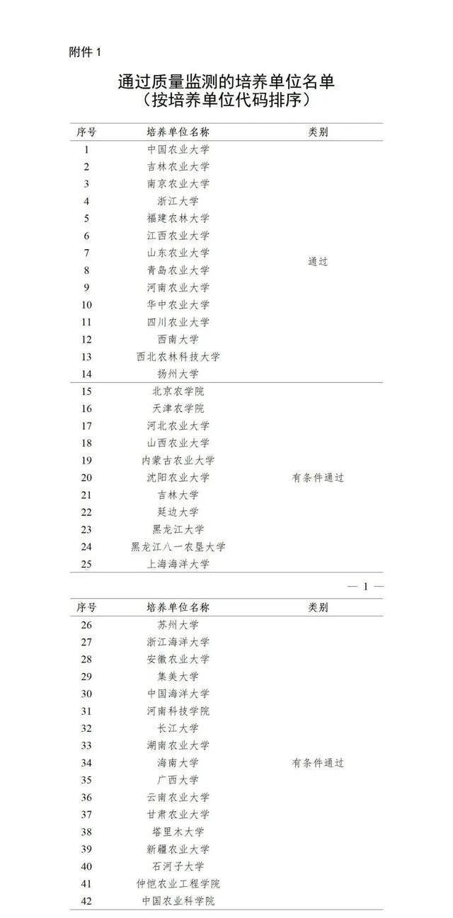 培养单位方面,中国农业大学等14所高校通过质量监测,北京农学院等27所高校和中国农业科学院有条件通过。