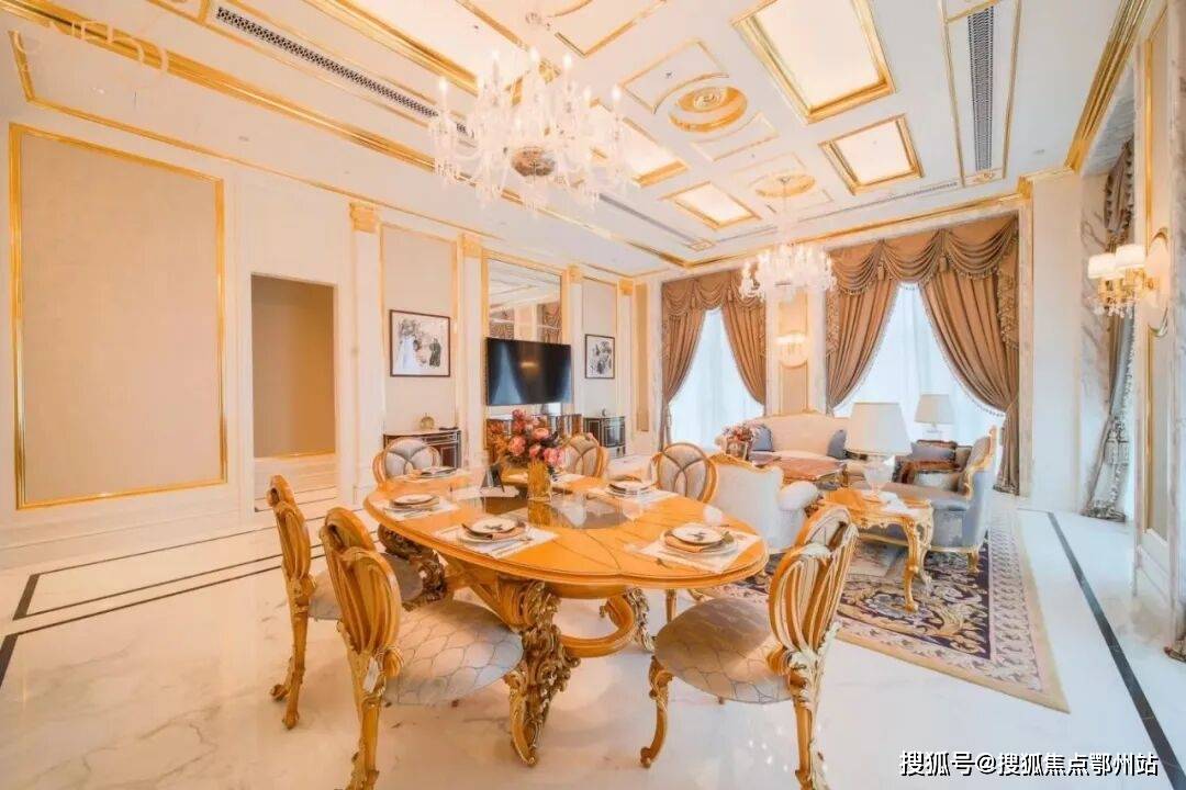 恢弘的客餐厅里,Baccarat的枝形吊灯在格子天花板高悬。爱奥尼壁柱间,边框贴满24K金箔的Interna装饰镜熠熠生辉。它有着新古典的所有华贵元素!0