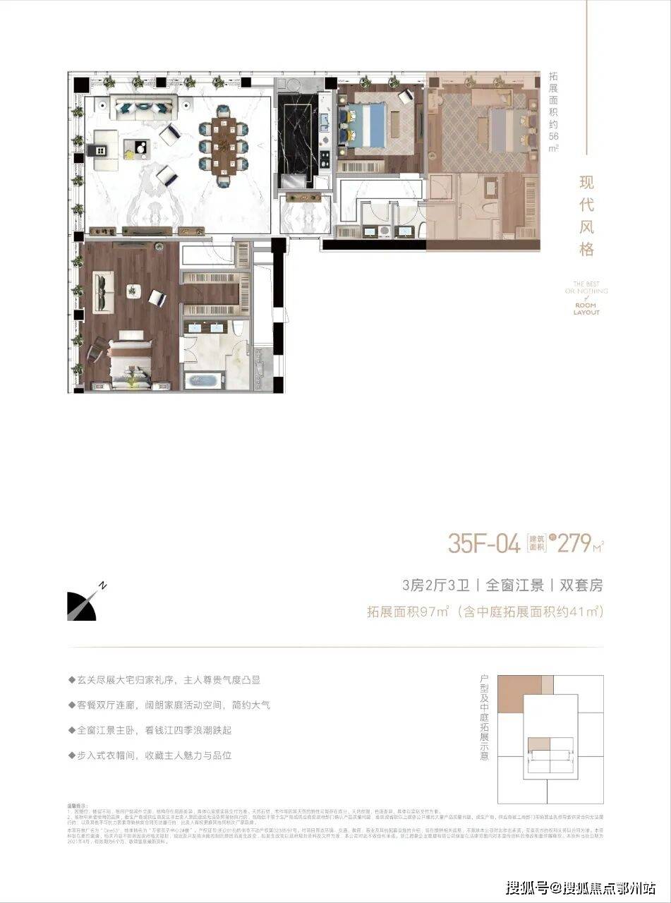 层高再“高一头”的ONE53,你可以想像有多霸气。以样板房约418㎡四房两厅四卫户型为例,两侧的采光面宽,
