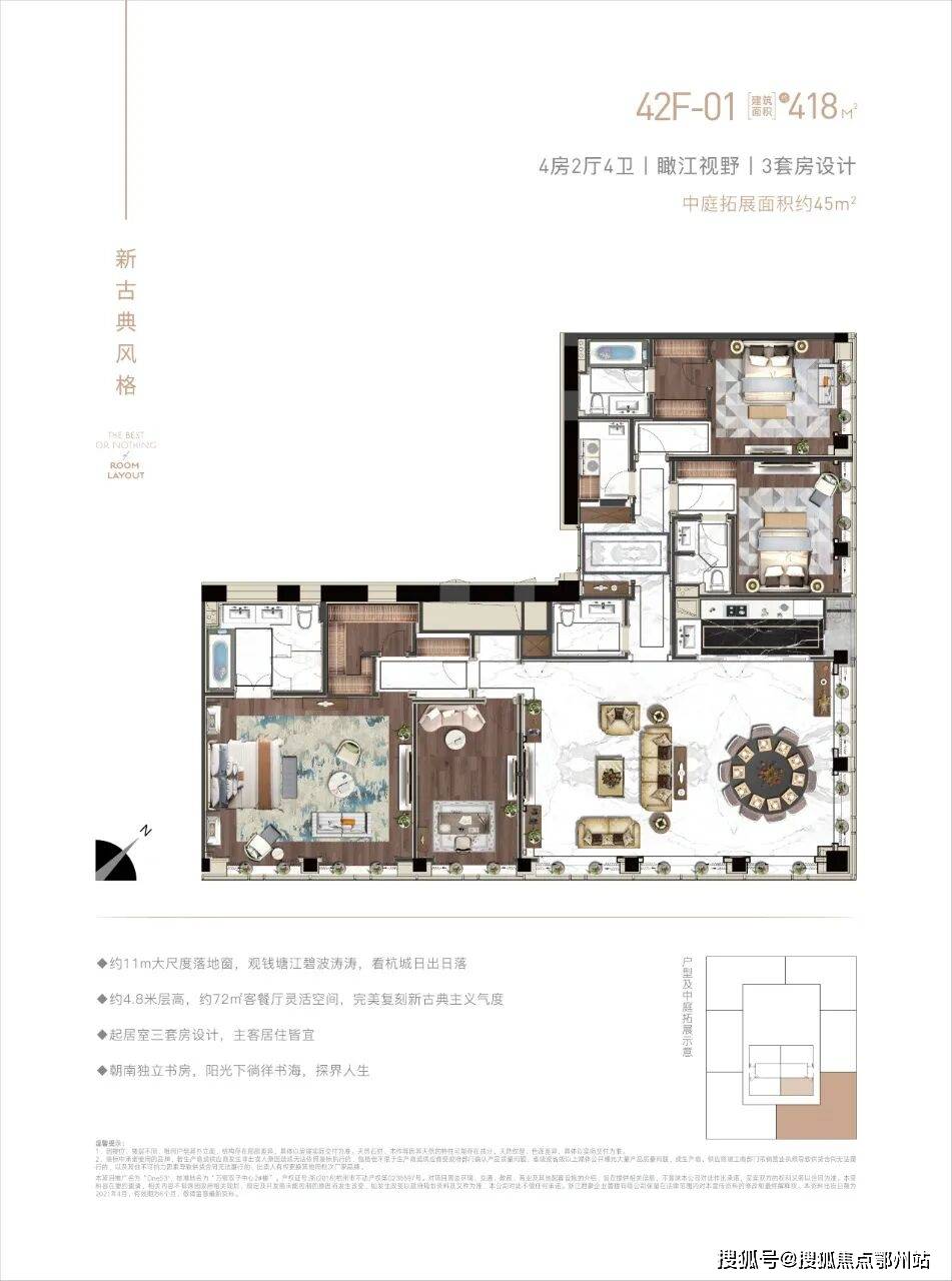 加在一起长达约38米。乘以层高,采光面积近180㎡,明媚到伤眼。因它近70%的房源层高近4.8米;除了顶跃,户型在244—418㎡之间。再现了“高门长戟,鸣钟食鼎”的上流生活尺度。