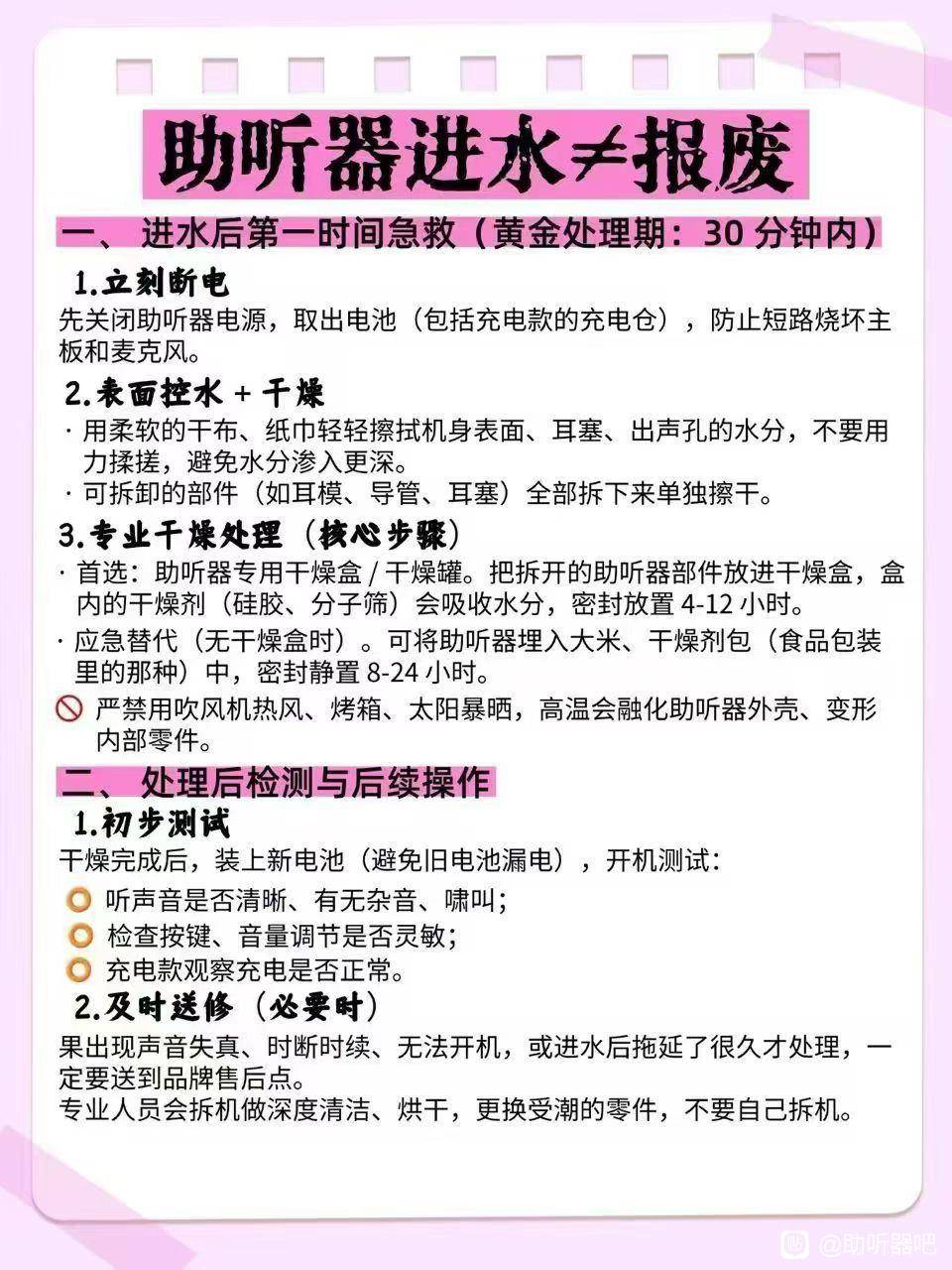 助听器进水报废一,进水后第一时间急救(黄金处理期:30分钟内)1。立刻断电先关闭助听器电源,取出电池防止短路烧坏主板和麦克风。2。表面控水+干燥。用柔软的干布,纸巾轻轻擦拭机身表面,耳塞,出声孔的水分,不要用力揉搓,避免水分渗入更深。。可拆卸的部件(如耳模,导管,耳塞)全部拆下来单独擦干。3。专业干燥处理(核心步骤)。首选:助听器专用干燥盒/干燥罐。把拆开的助听器部件放进干燥盒,盒内的干燥剂(硅胶,分子筛)会吸收水分,密封放置4-12小时。。应急替代(无干燥盒时)。可将助听器埋入大米,干燥剂包(食品包装里的那种)中,密封静置8-24小时。严禁用吹风机热风,烤箱,太阳暴晒,高温会融化助听器外壳,变形内部零件。二,处理后检测与后续操作1。初步测试干燥完成后,装上新电池(避免旧电池漏电),开机测试: O听声音是否清晰,有无杂音,啸叫;检查按键,音量调节是否灵敏;充电款观察充电是否正常。2。及时送修(必要时)果出现声音失真,时断时续,无法开机,或进水后拖延了很久才处理,一定要送到品牌售后点。专业人员会拆机做深度清洁,烘干,更换受潮的零件,不要自己拆机。