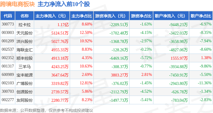 从资金流向上来看,当日跨境电商板块主力资金净流出35.72亿元,游资资金净流入3.17亿元,散户资金净流入32.55亿元。跨境电商板块个股资金流向见下表: