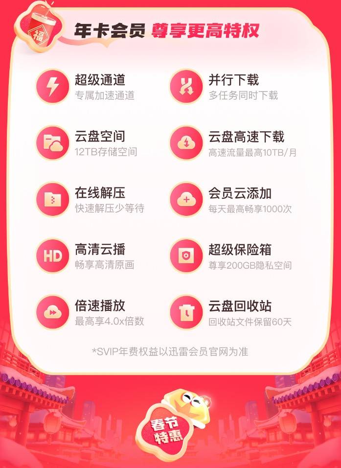 本次活动为用户量身打造超级会员年卡、双年卡两类套餐,总价低至3.8折。会员时长上,年卡加赠3个月、双年卡加赠6个月,实现会员权益“超长续航”。开通会员后,用户还能同步解锁迅雷、迅雷浏览器、迅雷影音三大产品40+项精选特权,多场景满足新春娱乐与日常使用需求。
