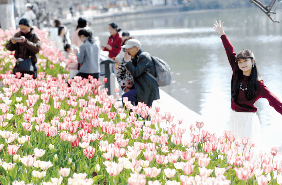 市民、游客在翠湖花海中打卡留影。赵伟摄