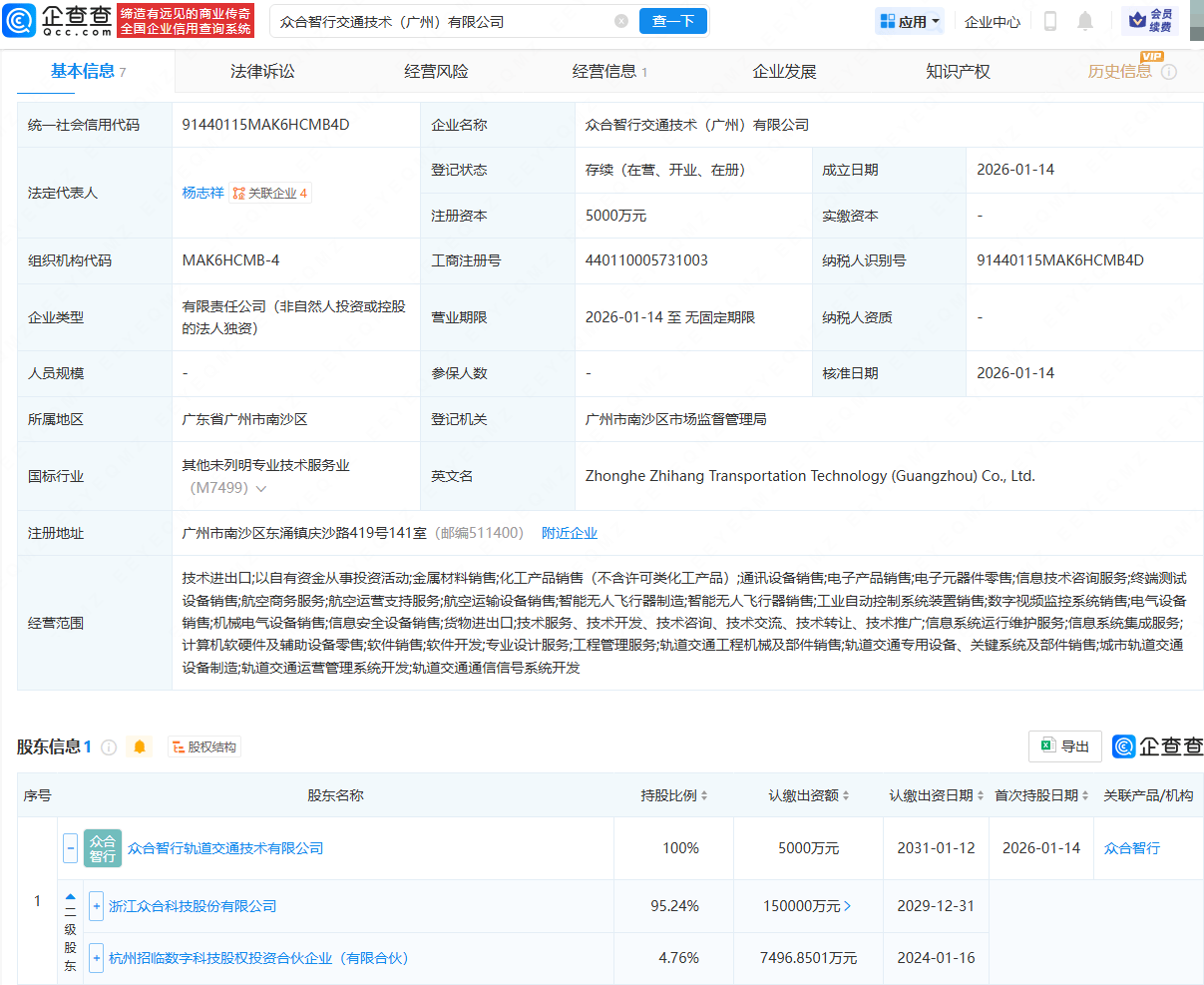 企查查APP显示,近日,众合智行交通技术(广州)有限公司成立,法定代表人为杨志祥,注册资本为5000万元,经营范围包含:航空商务服务;航空运营支持服务;智能无人飞行器制造;城市轨道交通设备制造等。企查查股权穿透显示,该公司由众合科技(000925)旗下众合智行轨道交通技术有限公司全资持股。