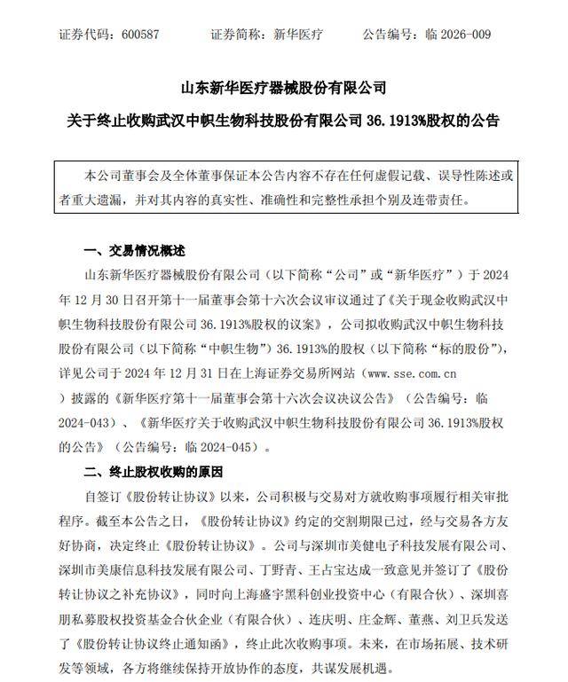 2月6日,新华医疗(600587.SH)公告称,公司与交易各方友好协商,决定终止收购武汉中帜生物科技股份有限公司36.1913%股权的事项。由于《股份转让协议》约定的交割期限已过,且付款先决条件未达成,公司未支付任何款项,因此不存在违约情形。本次收购的终止不会对公司现有经营业绩及财务状况产生不利影响。
