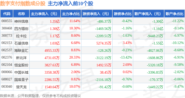 资金流向方面,数字支付(980113)指数成份股当日主力资金净流出合计1.08亿元,游资资金净流入合计8495.12万元,散户资金净流入合计1265.09万元。成份股资金流向详情见下表: