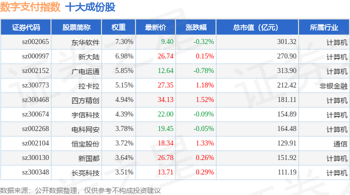 数字支付(980113)指数十大成份股详情如下: