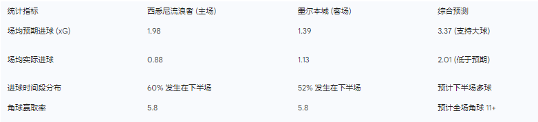 亚洲盘口目前维持在平手/半球(-0.25)主队低水。进球数盘口设定在2.5球/3球。尽管历史统计显示西悉尼流浪者本赛季的小球率很高,但预期进球数(Expected Goals)数据给出了完全不同的指示 。