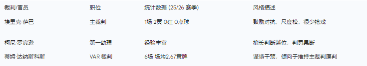 本场比赛的裁判安排由埃里克·萨巴(Eric Saba)担任主裁判。萨巴是一名正在崛起的中生代裁判,他本赛季在澳超的执法样本较少,此前仅有1场执法记录,出示了2张黄牌,判罚尺度相对宽松 。