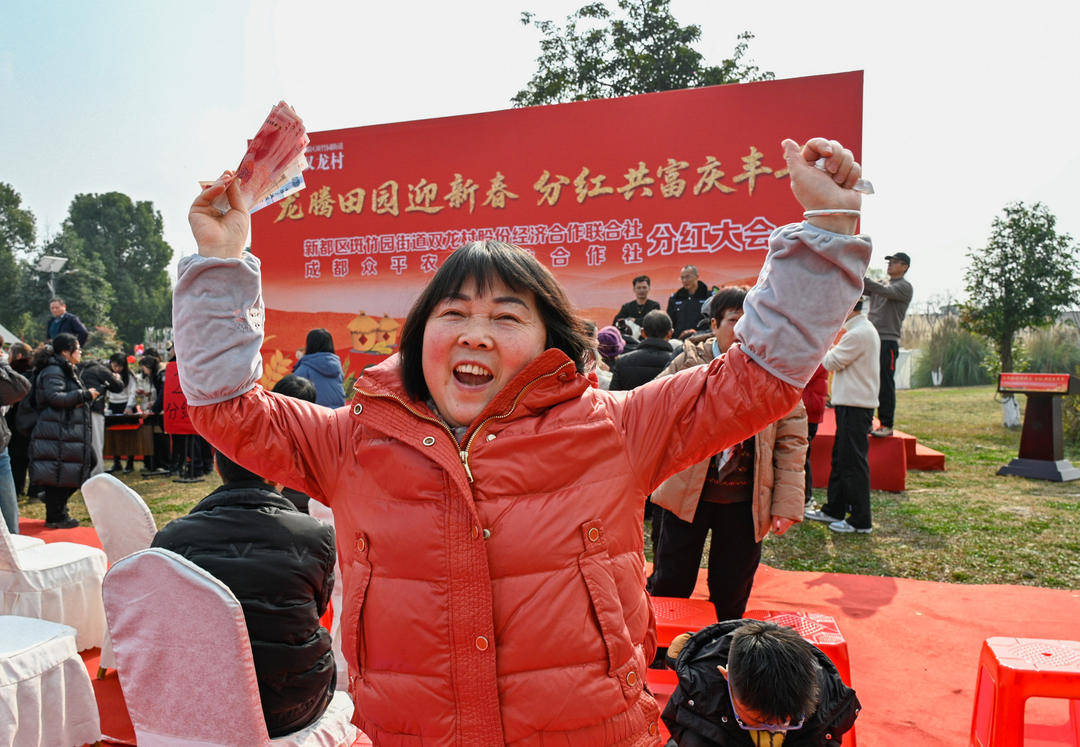 2月4日,成都市新都区斑竹园街道双龙村漫野音乐营地的草坪上,双龙村2026年分红大会正式开始。大红的对联、喜庆的福字、欢快的音乐、热闹的游戏,还有堆成小山的40余万元现金,让整个村子的村民脸上都洋溢着喜色。