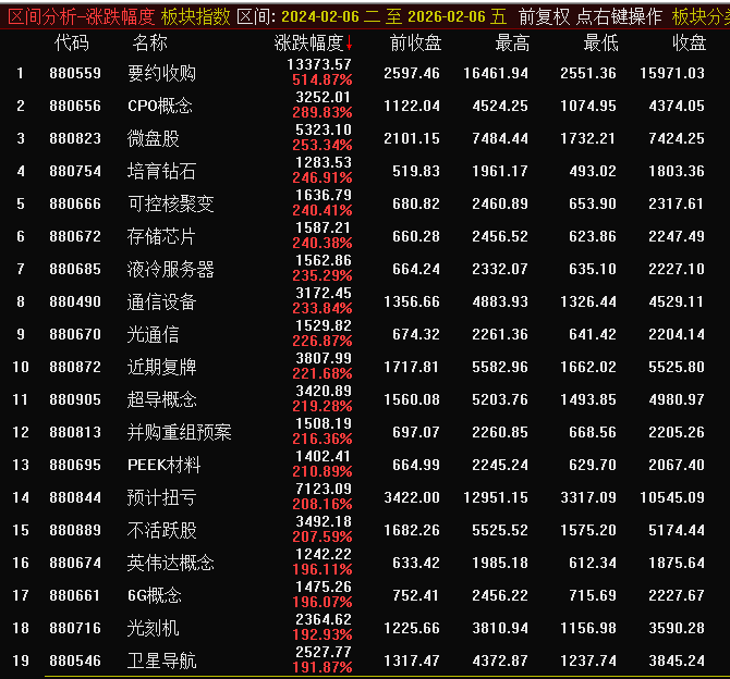 行业板块风格分类方面亦牛多熊少。除了酿酒、次新、山西板块2年来录得下跌外,其余不同程度拉升。其中,要约收购指数以514.87%的涨幅位居头名,CPO、微盘、培育钻石、可控核聚变、存储芯片等十多个分类指数涨幅超过了200%。
