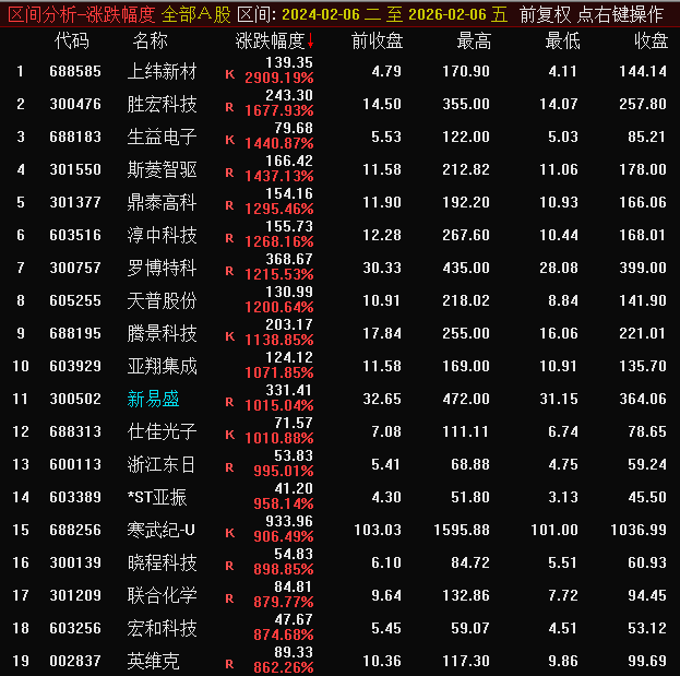 领涨个股中,上纬新材凭借高质量重组,盘中17个交易日13天触及20%涨停,最终以2909.19%的涨幅,一跃成为“牛魔王”。同期胜宏科技以1677.93%的涨幅位居亚军。生益电子以1440.87%的涨幅名列季军。