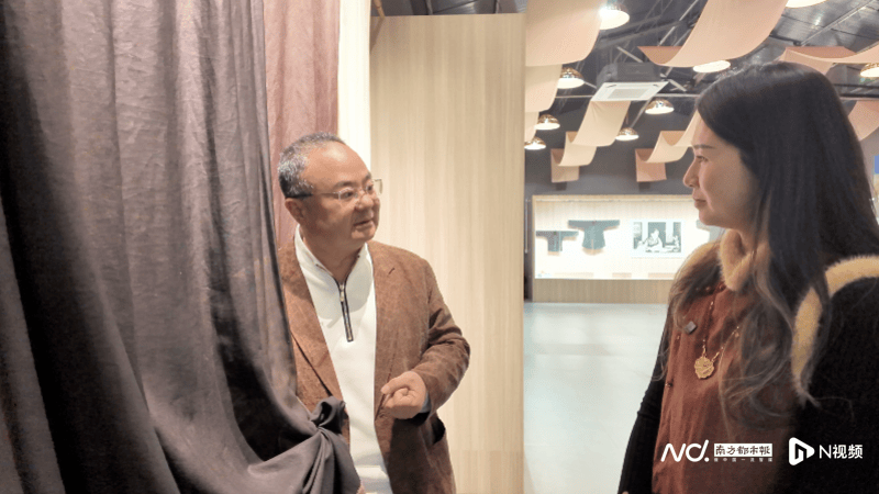 一卷卷精致的香云纱面料、黑色的香云纱男士西装、剪裁各异的香云纱连衣裙……文化园内,陈列着用香云纱制作的各色产品。在对话开始前容甄甄穿上了一件橘红色的新中式香云纱斜襟马甲,切身体会香云纱的面料特性和手工质感。