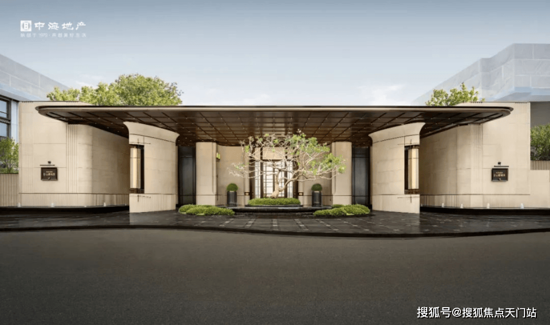项目的主入口,门头承袭玖字理念,约55m横向尺度与约7m纵向高度,高于传统的约4m高景墙,搭配通高陈列的全石材柱体,恭迎业主归家。