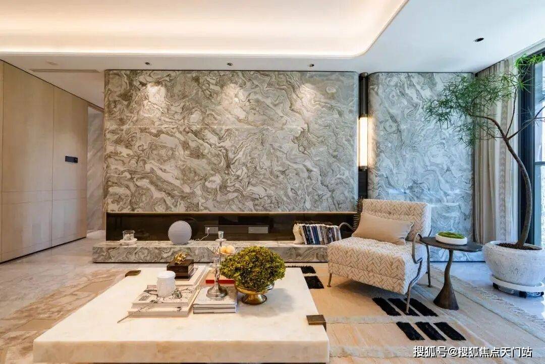 除了原来的标准,还大量选用了鱼肚灰、安第斯雪景、水云沙、雅柏灰...等多种名贵奢石。比如,客厅的电视背景墙、地面、主卫、飘窗等区域选材都升级为奢石。另外,客厅沙发背景墙、卧室背景墙升级为精美皮革,木饰面升级为温润影木,室内的豪宅气质更胜往昔!