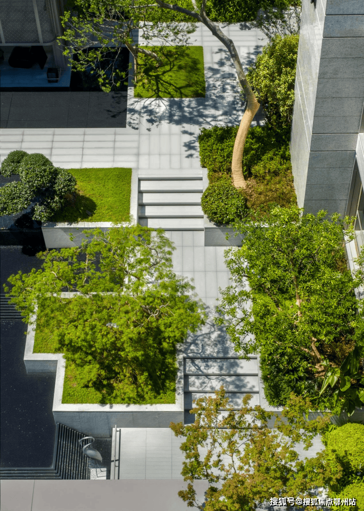 有背山必须傍水,从小区正门的独立高端会所进入园区后,之江壹品特意作了退进式梯度入口,中心引入意式跌水水景;从两侧围着水景、顺着山势的缓坡台阶漫步往上,在跌水的终端是卡洛斯卡帕式的雕塑出水口和一棵中型落叶乔木作纪念性空间;