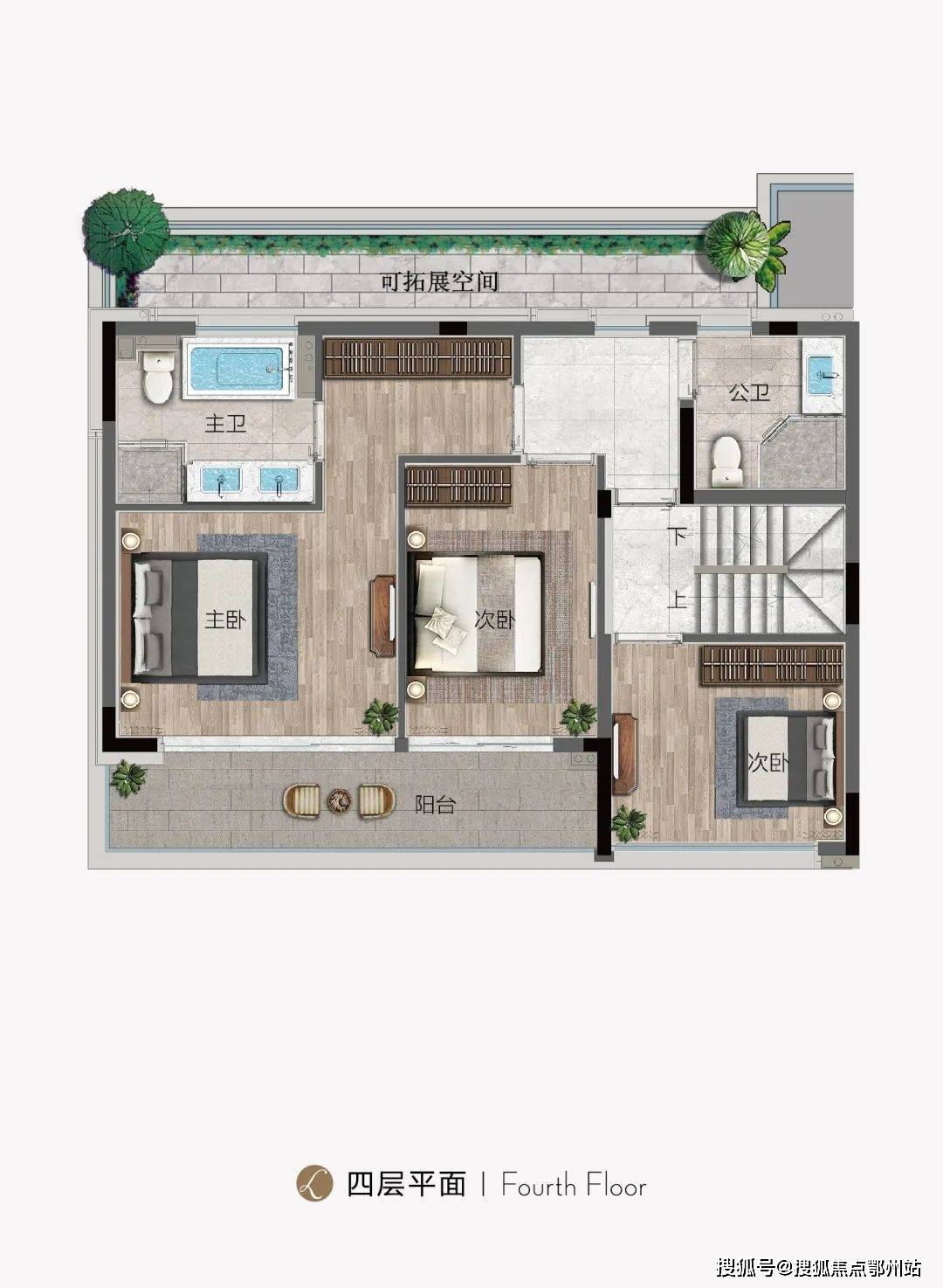 下叠带私享院子,下叠的一楼客餐厅直通约50-60㎡南向庭院,部分可达约100㎡花园,尺度豪华的主卧空间搭配足有7.2米长的连廊阳台,形成“主卧—书房—连廊阳台”的格局,即使起居在二层,也能与自然形成良好的互动。