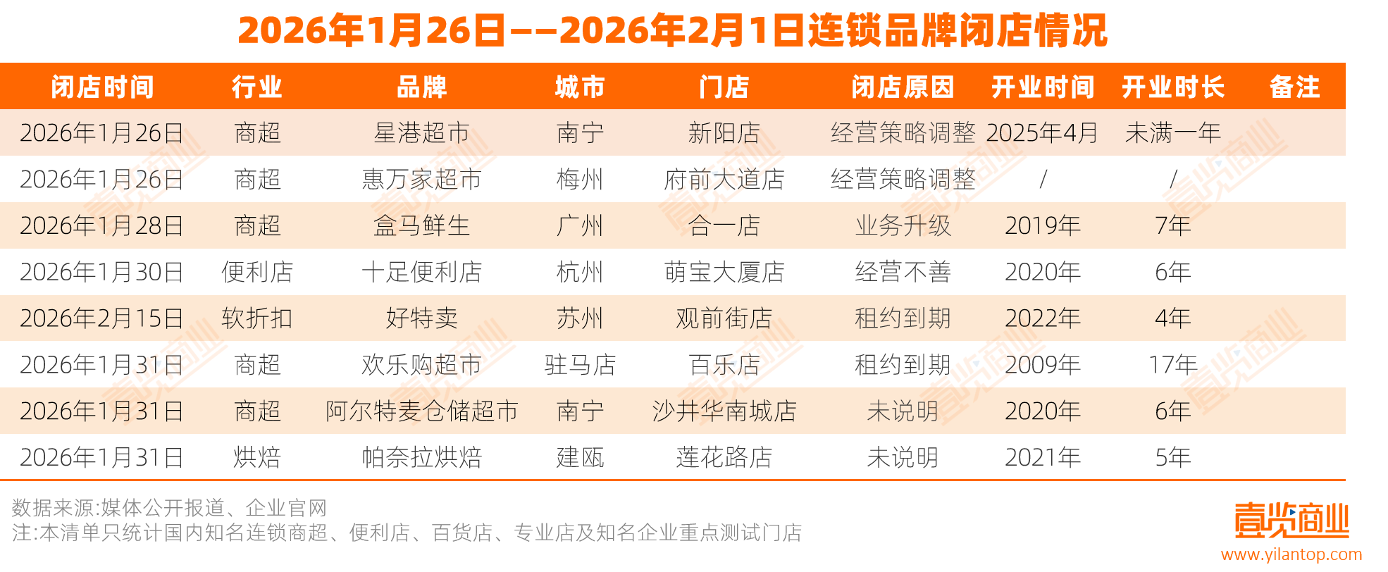 据壹览商业不完全统计,2026年1月26日——2026年2月1日,国内知名连锁超市、便利店、百货店、专业店及知名企业重点测试门店,共有8个连锁品牌关闭了至少8家门店。
