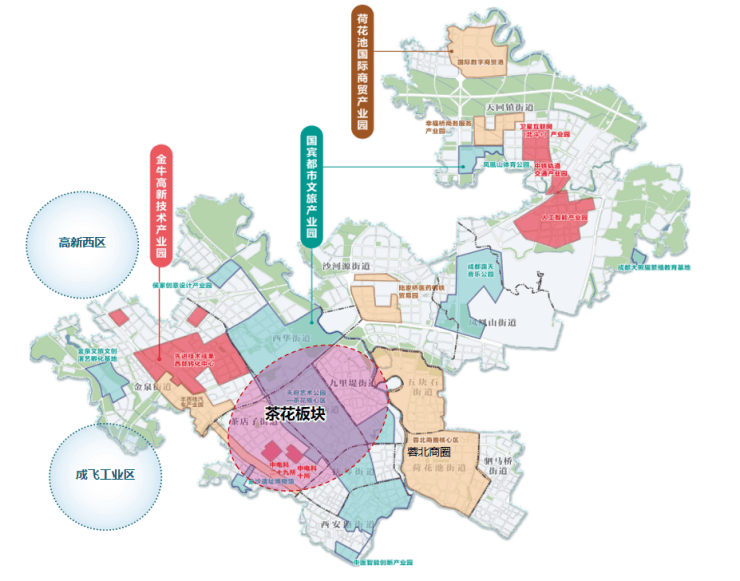 茶花板块定位为“西南科技创新应用首发地”与“成都文商旅融合体验消费新中心”,具三大功能支撑:
