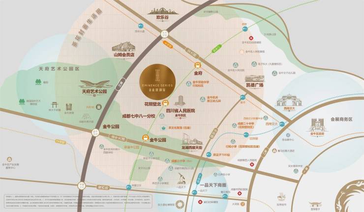 板块构建“三纵五横四轨”城市级交通骨架,地铁四线交汇,金牛大道等主干道纵横贯通,快速串联天府广场、宽窄巷子、天府艺术公园等城市核心地标。