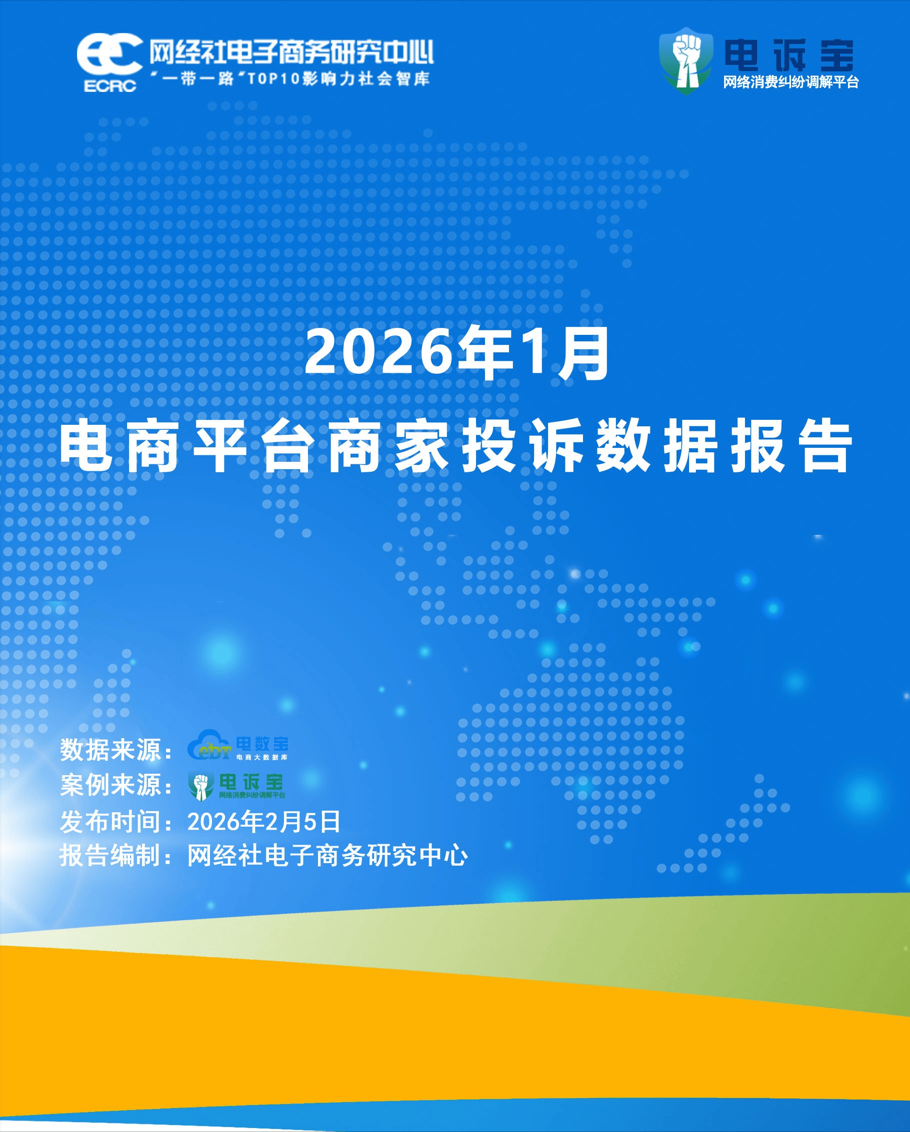 在此背景下,2月5日,依据网络消费纠纷调解平台“电诉宝”商家投诉通道1月受理的全国电商平台大量商家投诉案例,网经社电子商务研究中心例行发布《2026年1月电商平台商家投诉数据报告》。报告涉及了综合电商、直播电商、电商服务商、生活服务电商等领域,并公布了1月电商平台商家投诉数据及十大典型案例,通过这些投诉案例可窥见当前电商平台商家困境。