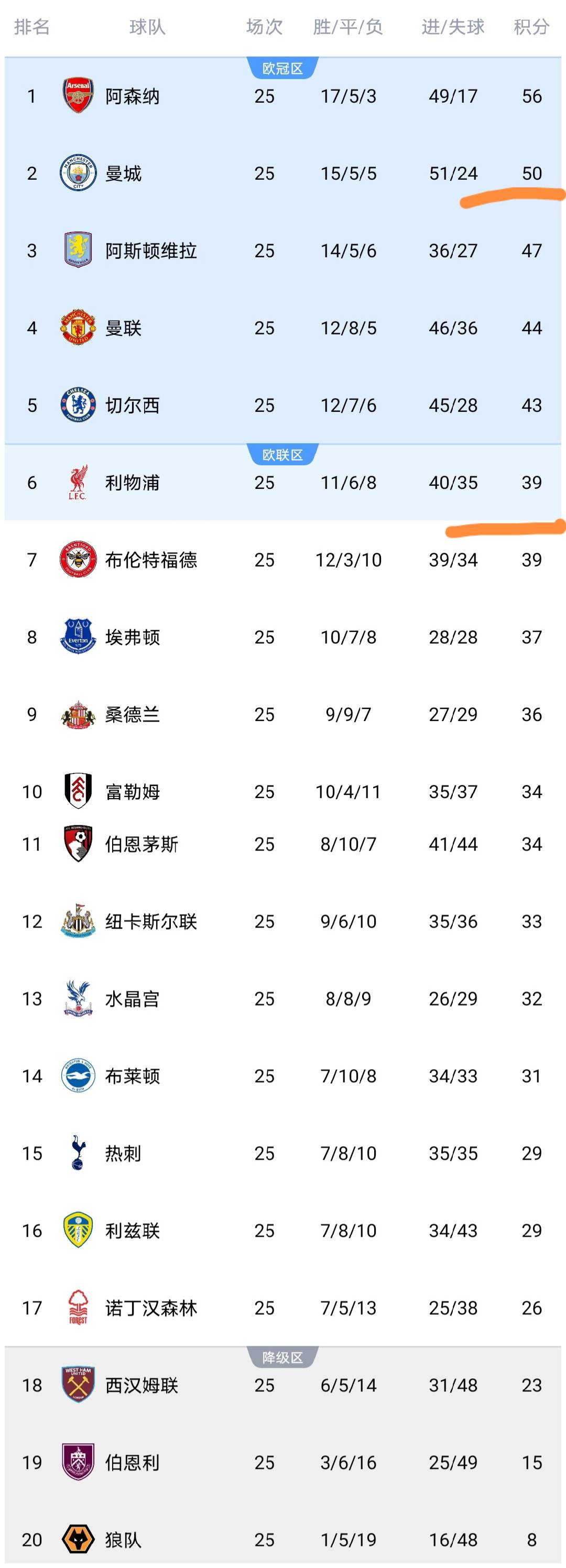 今天凌晨,英超第25轮结束了最后2场比赛,利物浦、布莱顿、曼城等队出战,这两场比赛之后,英超所有球队都已经踢完了第25轮的比赛,英超积分榜随之发生变化,我们来看看。