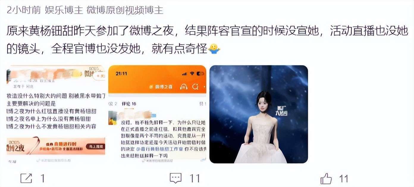 虽然微博之夜的明星阵容早早就被官宣过,但其中一位女明星的出现,却出乎了大家的意料。她就是黄杨钿甜,竟然没有在官方的名单里,直播时也没有她的镜头,这让不少网友都没能注意到她的到来。直到之后,才有黄杨钿甜走红毯的照片流出,才让大家恍若惊觉,她原来也参加了微博之夜。