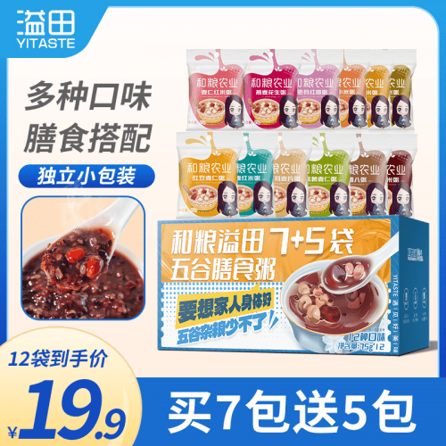 和粮溢田五谷膳食粥推出了多种口味,包括红豆小米粥(黄小米、大米、糯米、小红豆、红米、黑豆),玫瑰红米粥(红米、大米、黑米、糯米、小麦仁、红小豆、红皮花生、重瓣红玫瑰),红豆麦仁粥(大米、红米、小麦仁、地瓜干、糯米、绿豆、荞麦米、豇豆),腊八粥(大米、黄小米、玉米糁、大黄米、黑米、芸豆、红小豆、花生仁、莲子),麦仁红米粥(大米、燕麦米、红高粱、玉米糁、黄小米、红米、糙米、小麦仁),南瓜糯米粥(大米、糯米、绿豆、红高粱、燕麦米、红小豆、南瓜干、小麦仁),玉米银耳麦片粥(玉米糁、燕麦片、小麦仁、黑米、银耳),高粱黑米粥(大米、黑米、糯米、黄小米、红高粱、红小豆、绿豆、枸杞、去核枣片),荞麦小米粥(黄小米、红高粱米、荞麦米、燕麦米、玉米糁、红米),胚芽红枣粥(胚芽米、小麦仁、糯米、红小豆、花生仁、薏仁米、去核枣片),紫薯麦仁粥(大米、小麦仁、红米、黄小米、燕麦片、紫薯丁、红小豆、花生仁、红米),燕麦花生粥(大米、燕麦片、黄小米、花生仁、玉米糁、红米、去核枣片)。