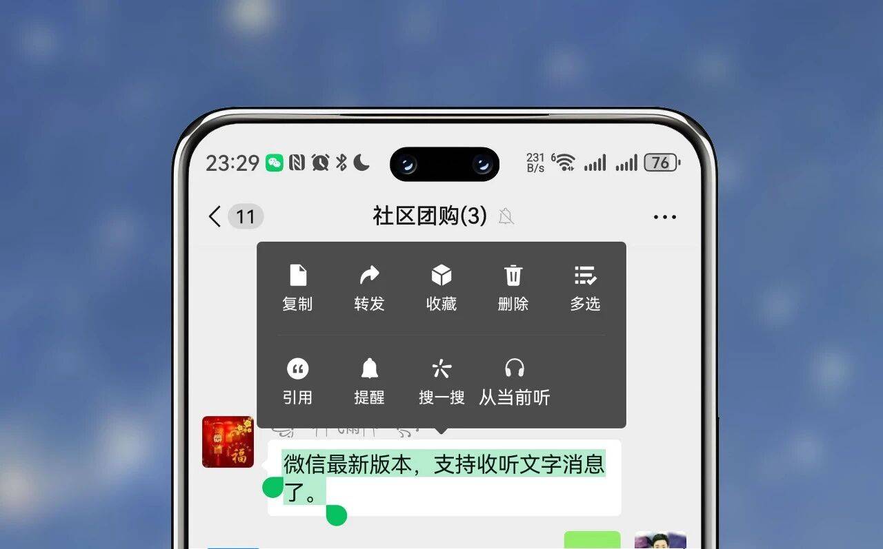 点击这个功能之后,微信会把选中的这条文字消息识别为语音并且自动读出来。读完这条消息之后,会继续朗读下面的文字消息。