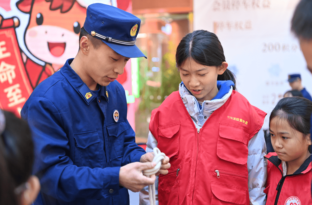 本次活动以“文艺表演+实景体验+全民互动”的多元形式,通过消防志愿者歌舞表演、有奖问答集印章、试穿战斗服、学打绳结等互动环节,让现场群众“沉浸式”掌握消防知识。
