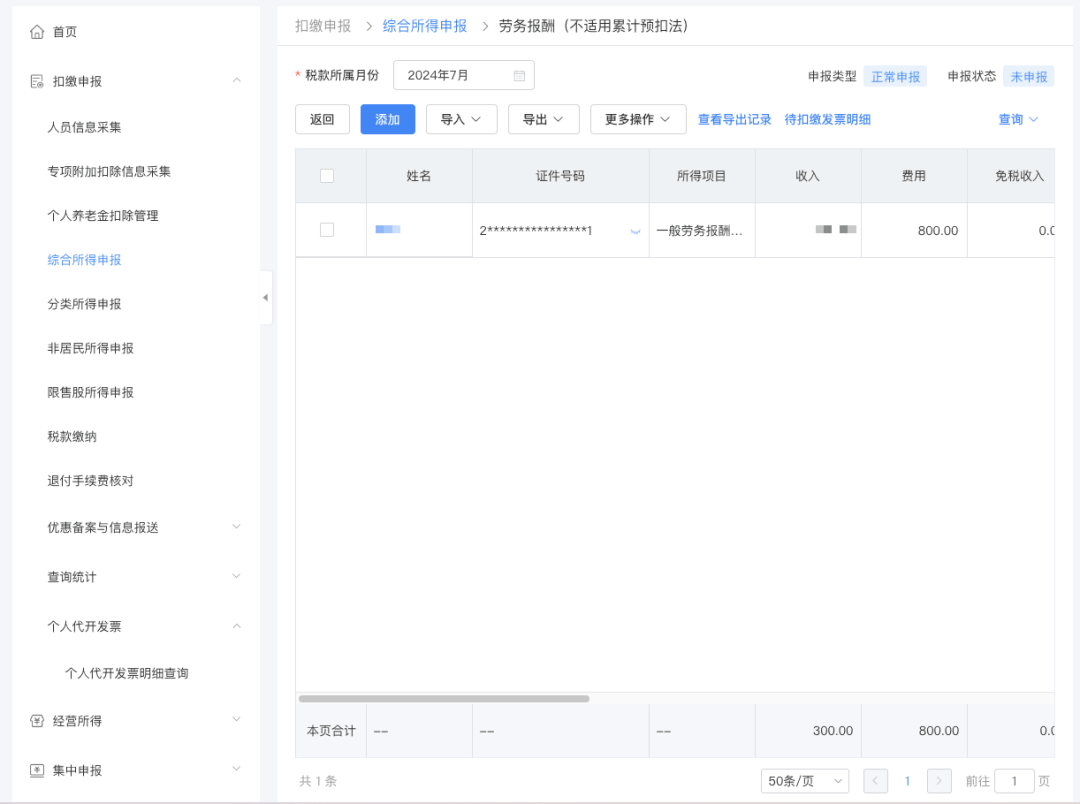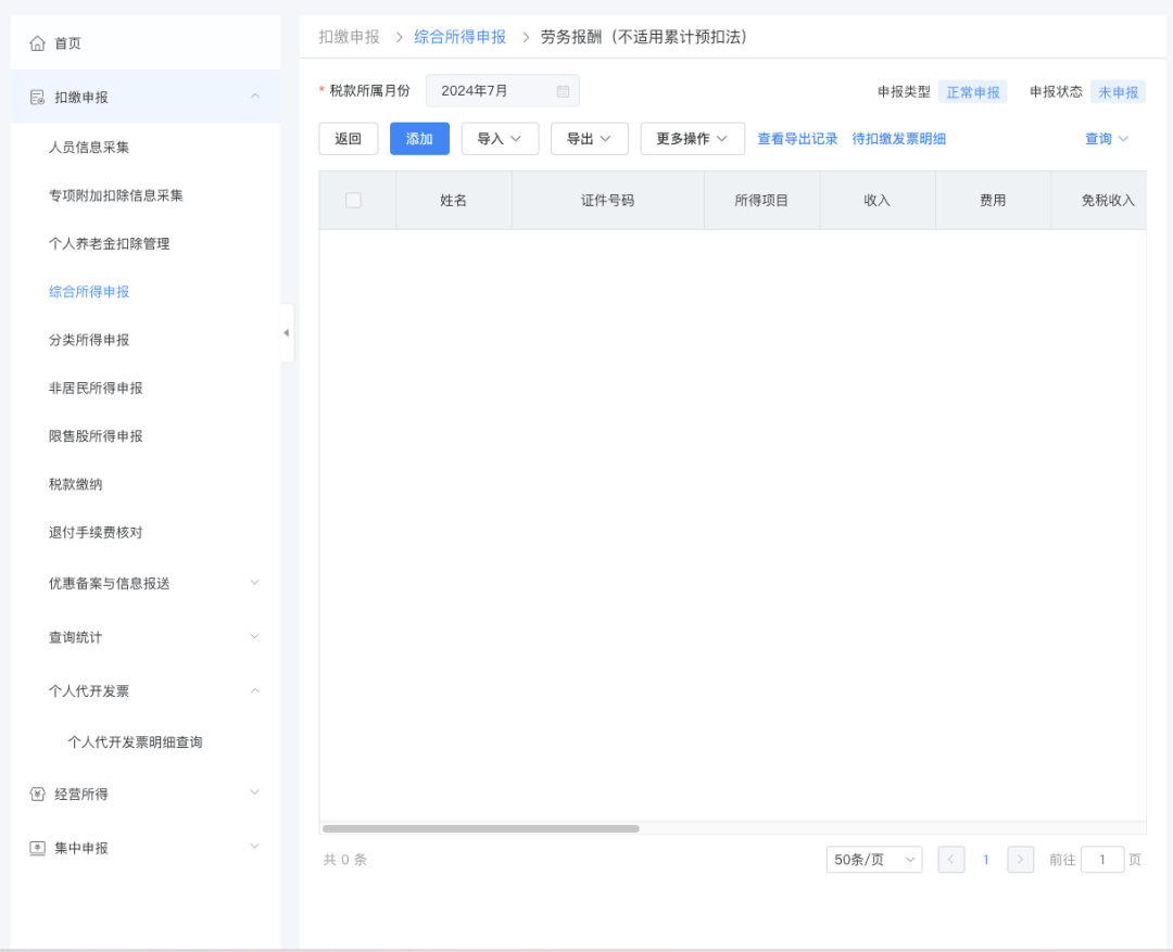 也可以在录入扣缴申报收入信息时手动关联发票。点击“添加”按钮进入扣缴申报填写页面,选择需扣缴申报的自然人。