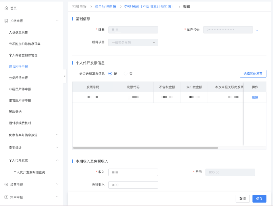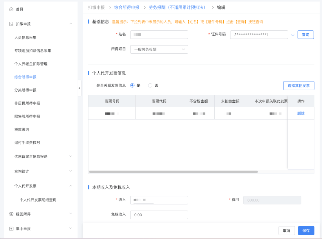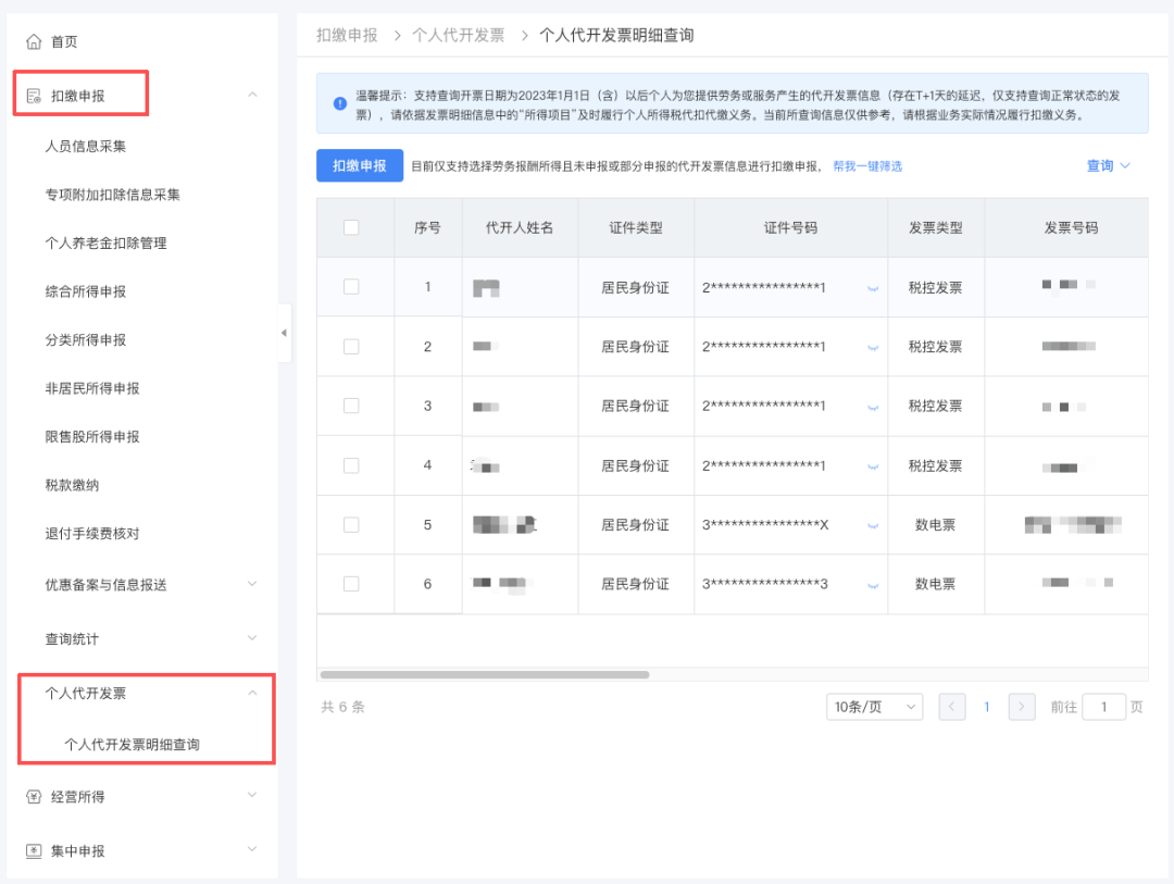 场景 A:通过“个人代开发票明细查询”扣缴申报关联发票