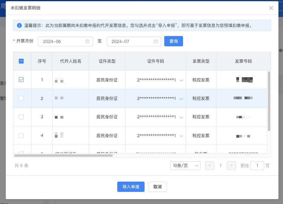 点击页面上方区域“查询”按钮左侧的“待扣缴发票明细”按钮,将出现弹窗,展示非汇总代开的所得项目为劳务报酬所得、申报状态为未申报或部分申报、发票状态为正常的发票数据。可单选或多选发票数据,点击“导入申报”按钮,系统根据发票信息自动生成相应的申报数据。