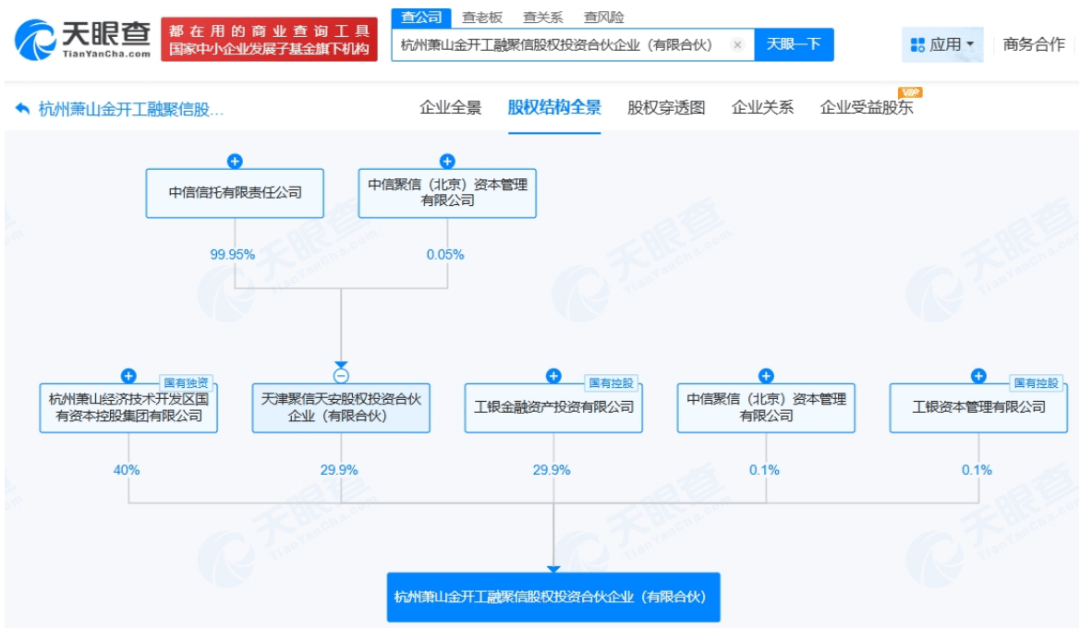 天眼查App显示,近日,杭州萧山金开工融聚信股权投资合伙企业(有限合伙)成立,执行事务合伙人为中信聚信(北京)资本管理有限公司,出资额10亿人民币,经营范围为股权投资、创业投资,由杭州萧山经济技术开发区国有资本控股集团有限公司、工银金融资产投资有限公司、中信信托旗下天津聚信天安股权投资合伙企业(有限合伙)等共同出资。