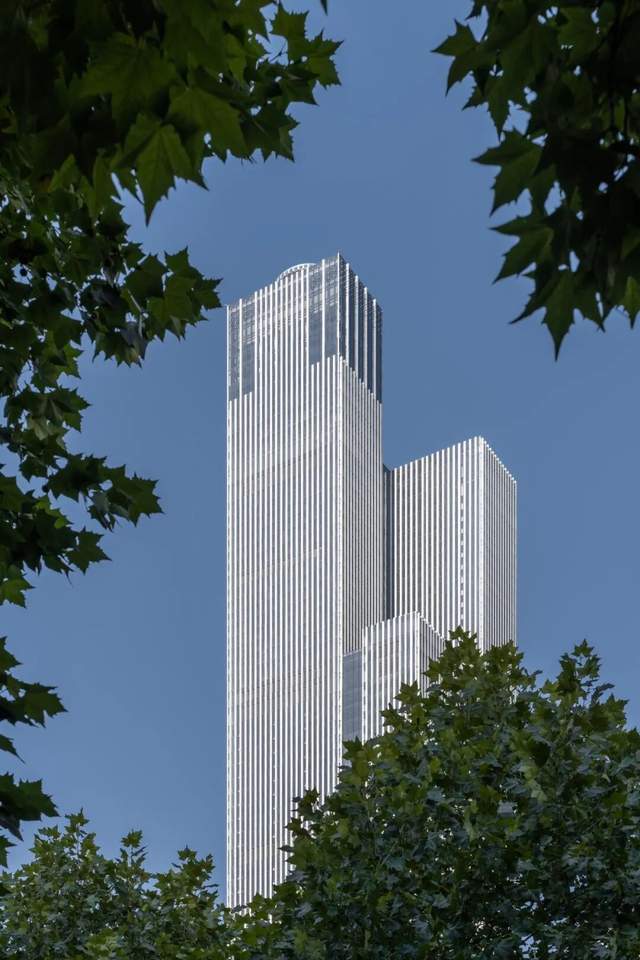 塔楼由三组错动的体量组合而成,在灵动中保持着整体的节奏感。外观呈现简洁大气的几何线条,形体修长而富有层次,幕墙质感高级,以冷峻利落的现代风格塑造出极具未来感的城市天际线。