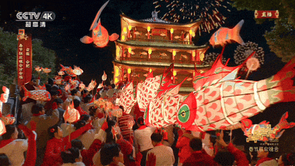农历大年初一,游客沉浸式体验鱼灯游园活动 图片来源:央视新闻