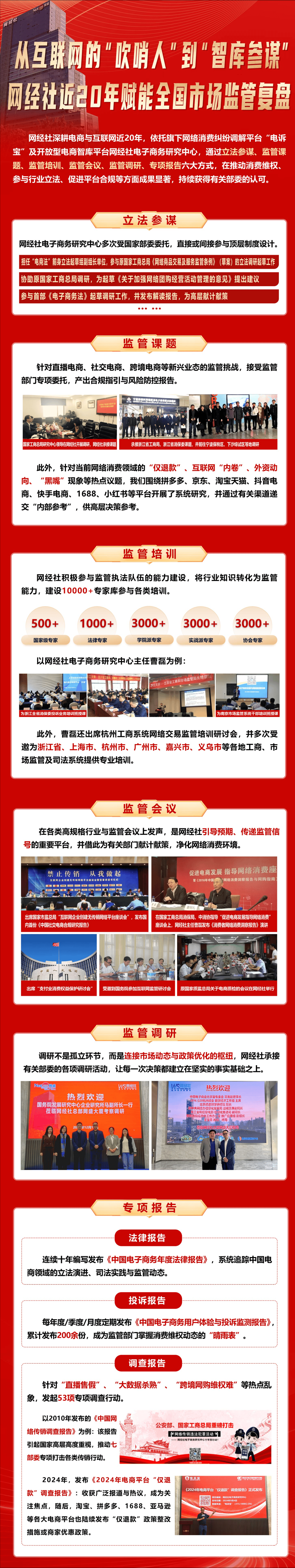 网经社深耕电商与互联网近20年,依托旗下网络消费纠纷调解平台“电诉宝”及开放型电商智库平台网经社电子商务研究中心,通过立法参谋、监管课题、监管培训、监管会议、监管调研、专项报告六大方式,在推动消费维权、参与行业立法、促进平台合规等方面成果显著,持续获得有关部委的认可。