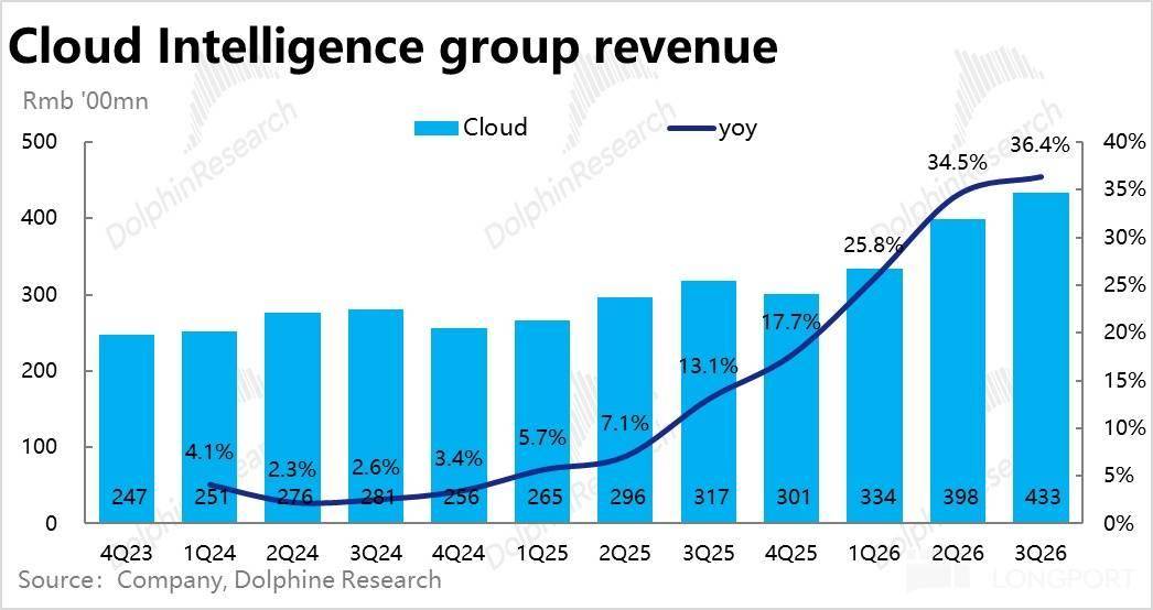 在另一主线—AI/云业务上,阿里本季表现则依然亮眼。阿里云营收增长 36%,和市场预期一致,如期较上季的 34.5% 进一步小幅加速。