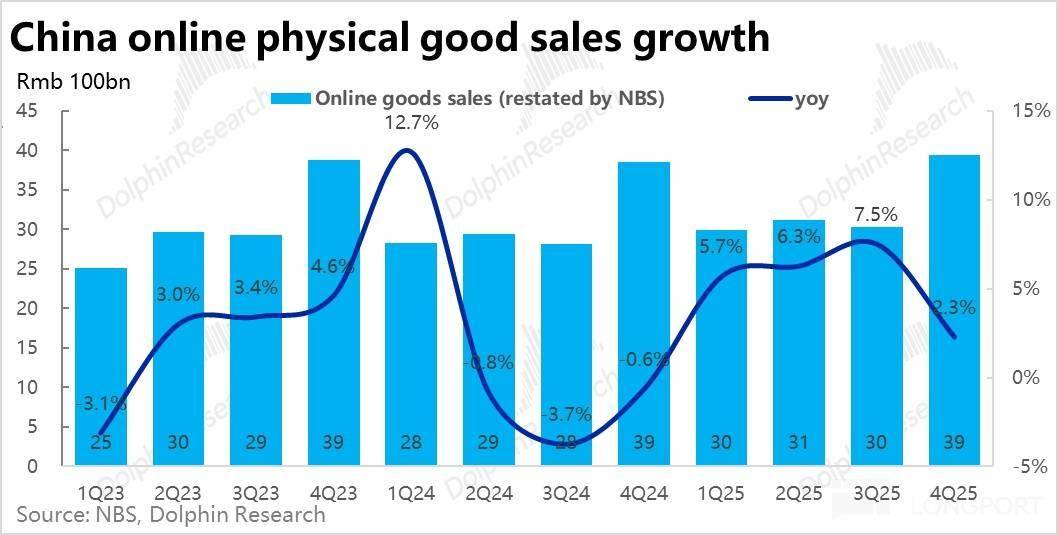不过,此次4Q 电商增长如此疲软的诱因之一,是春节时间偏后导致的消费被后置。最新公布的 1~2 月内线上商品销售增长达 10% 以上,反弹明显。4Q25+2M26 合计线上零售额同比增速在 5.4% 左右,在放缓但没那么差。