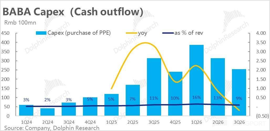另外,本季度的 Capex 支出为 299 亿,现金 Capex 支出则为 253 亿,环比上季有所回落,26 财年以来投入持续收窄,可能有英伟达芯片被禁入的影响。