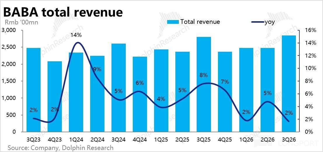 外卖和 AI 两条战线上双线出击的$阿里巴巴(BABA.US),今晚(3.19)美股盘前发布了 26 财年 3 季度业绩。整体来看,从预期差角度,除了国际电商增长偏弱和其他业务亏损更多外,大体表现是和已最新已下调过的指引接近的。但绝对表现上,无疑是比较弱的。